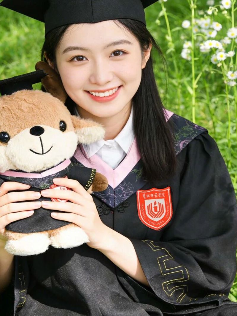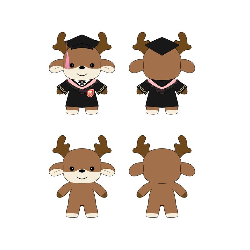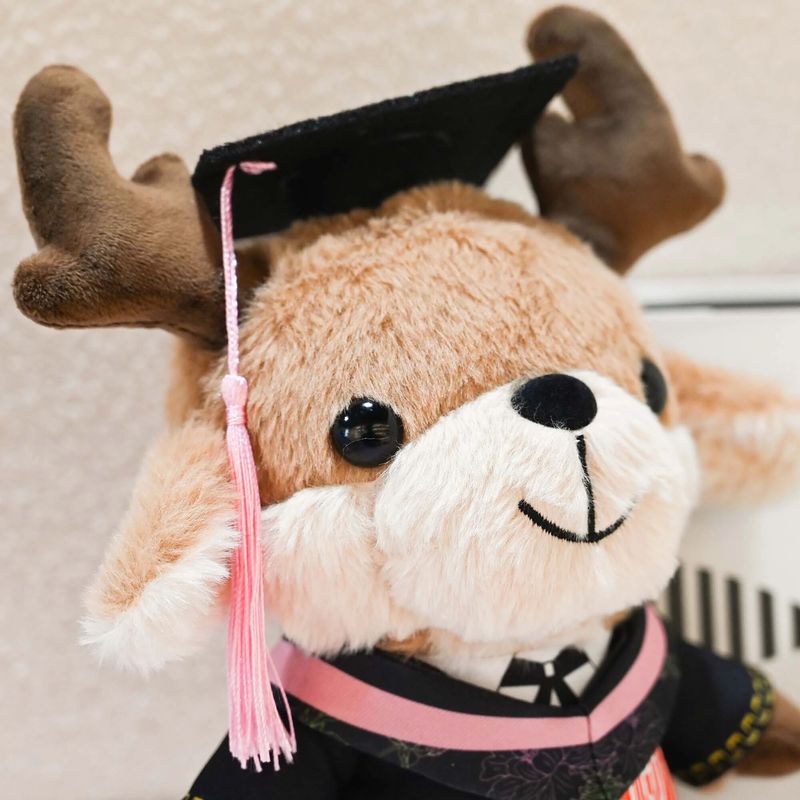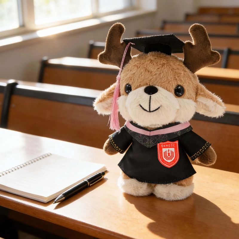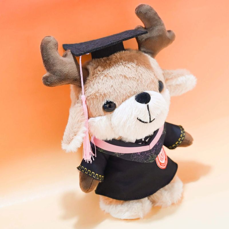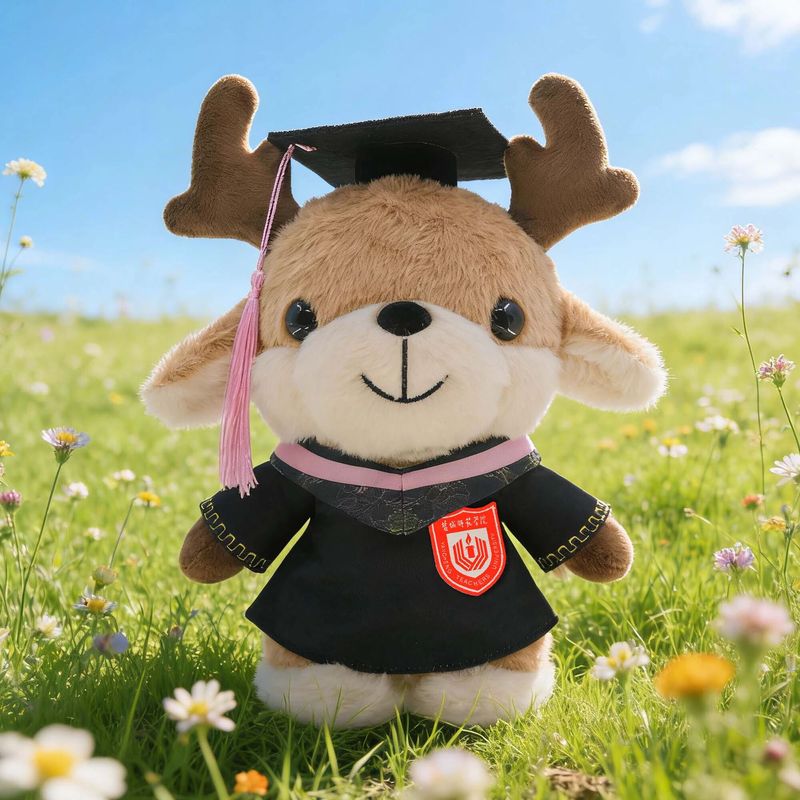 此刻,它身披学士服、头戴博士帽,以国家一级保护动物麋鹿为原型,从东方湿地之都的晨雾中走来——生于滩涂,长于书香。软绒里藏着湿地的温润,胸口刺绣的校徽,镌刻着盐师人的身份;流苏轻摇,系着青春的仪式,也牵着游子与母校的羁绊。
